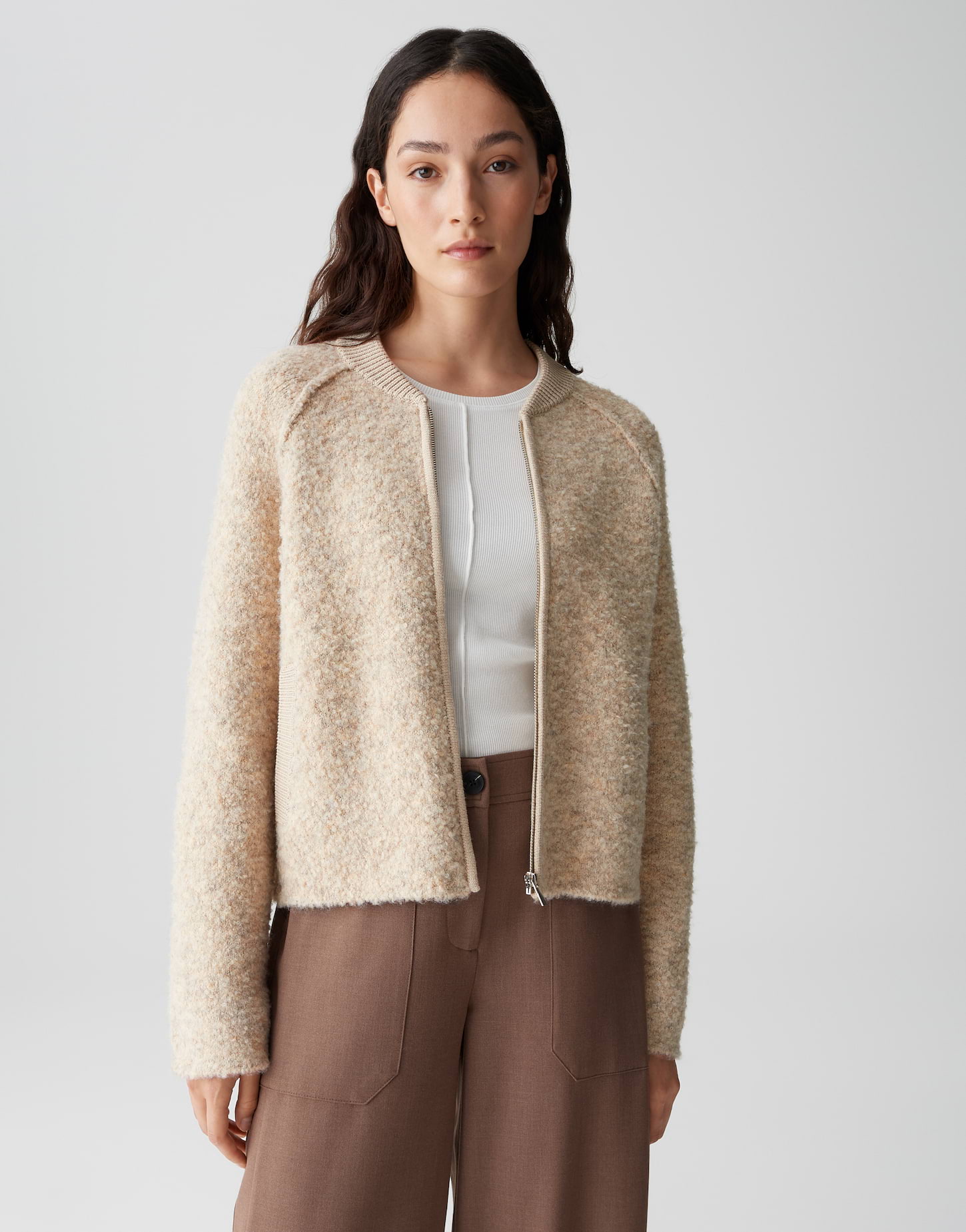 Die Strickjacke "Delny" von OPUS bringt gemütlichen Chic in die kühle Jahreszeit. Das grob gestrickte Bouclé-Garn sorgt für eine besonders weiche Haptik und ein wärmendes Tragegefühl, während der sportliche Blousonstil mit Reißverschluss und schrägen Eingrifftaschen einen modernen, lässigen Look kreiert. Perfekt für entspannte Alltagsoutfits mit stilvoller Note.