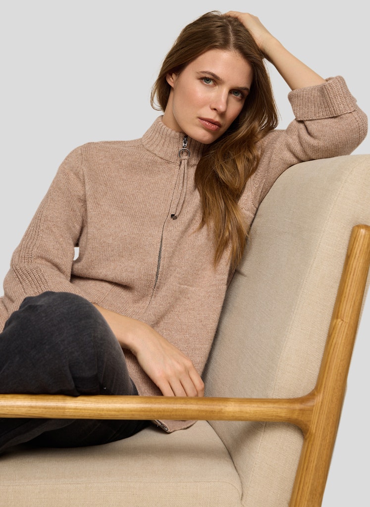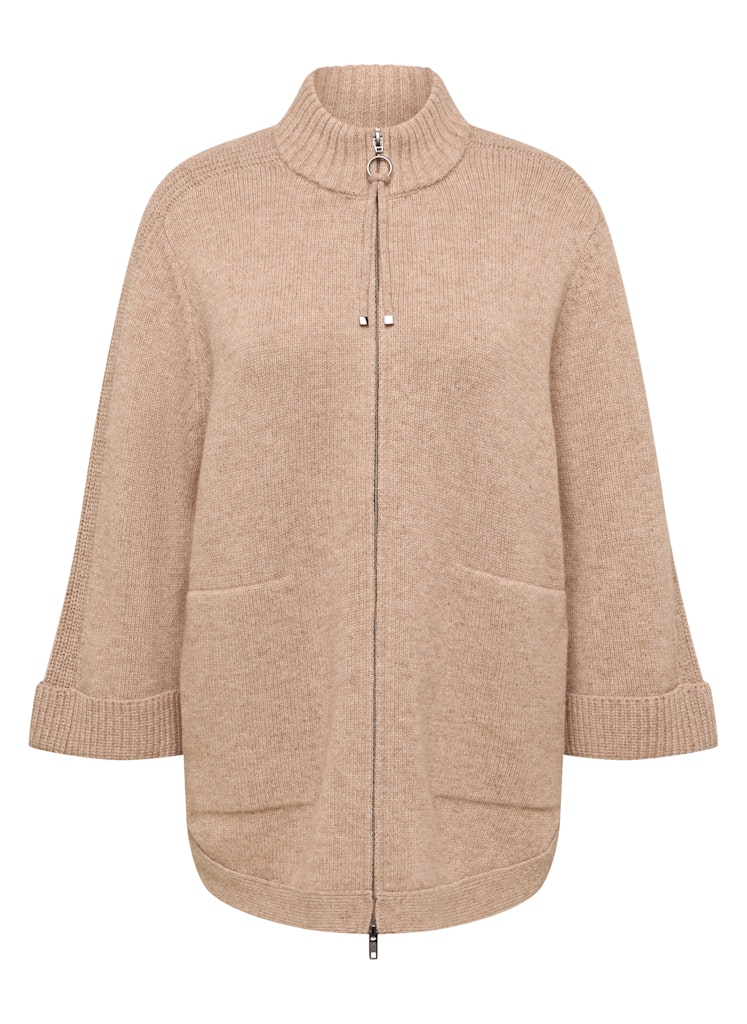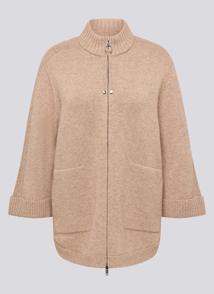 Diese modern geschnittene Strickjacke vereint natürlichen Komfort mit modischem Design. Dank ihres hochwertigen Wollmixes mit Modal und einem Anteil an Maguey _ einer pflanzlichen Naturfaser _ bietet sie ein angenehm weiches, leicht strukturiertes Tragegefühl. Der gerippte Stehkragen mit Tunnelzug, die praktischen Taschen und die modischen 3/4-Ärmel mit Umschlag machen sie zum idealen Kombipartner für Übergangs-Outfits. Mit pflanzlicher Maguey-Faser. 3/4-Ärmel mit Umschlag. Gerippter Stehkragen. Zwei aufgesetzte Taschen. Reißverschluss vorn.