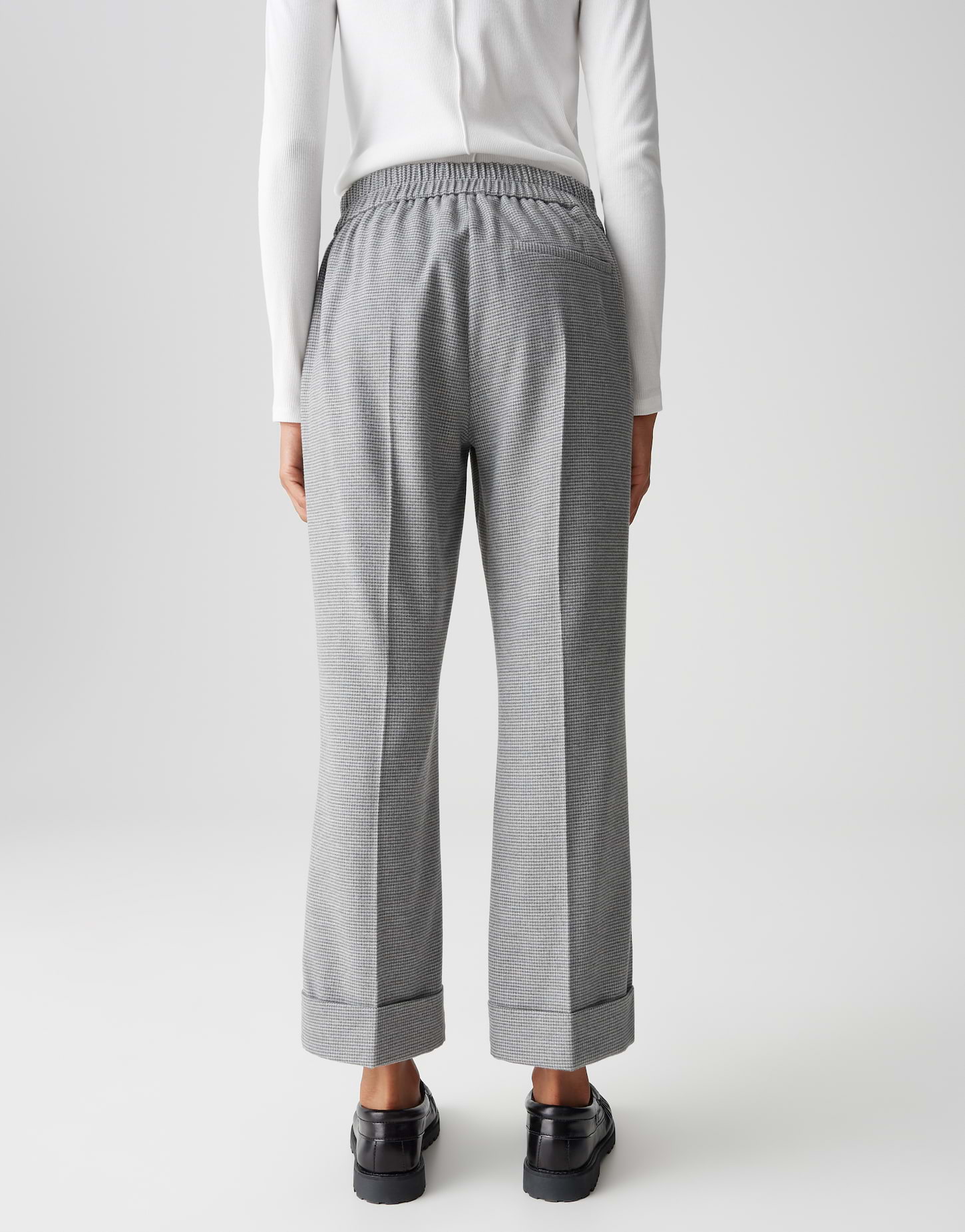 Diese stilvolle Hose von Opus überzeugt durch ihren zeitlosen Chic und hohen Tragekomfort. Das feine Hahnentrittmuster verleiht ihr einen klassischen Look, während der elastische Bund und die weite Passform für ein angenehmes Tragegefühl sorgen. Mit ihrer eleganten Bügelfalte und den umgeschlagenen Beinabschlüssen eignet sich die Hose perfekt für Büro-Outfits oder stilvolle Alltags-Looks.