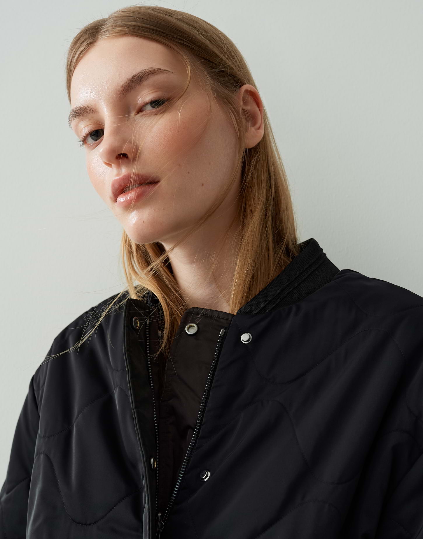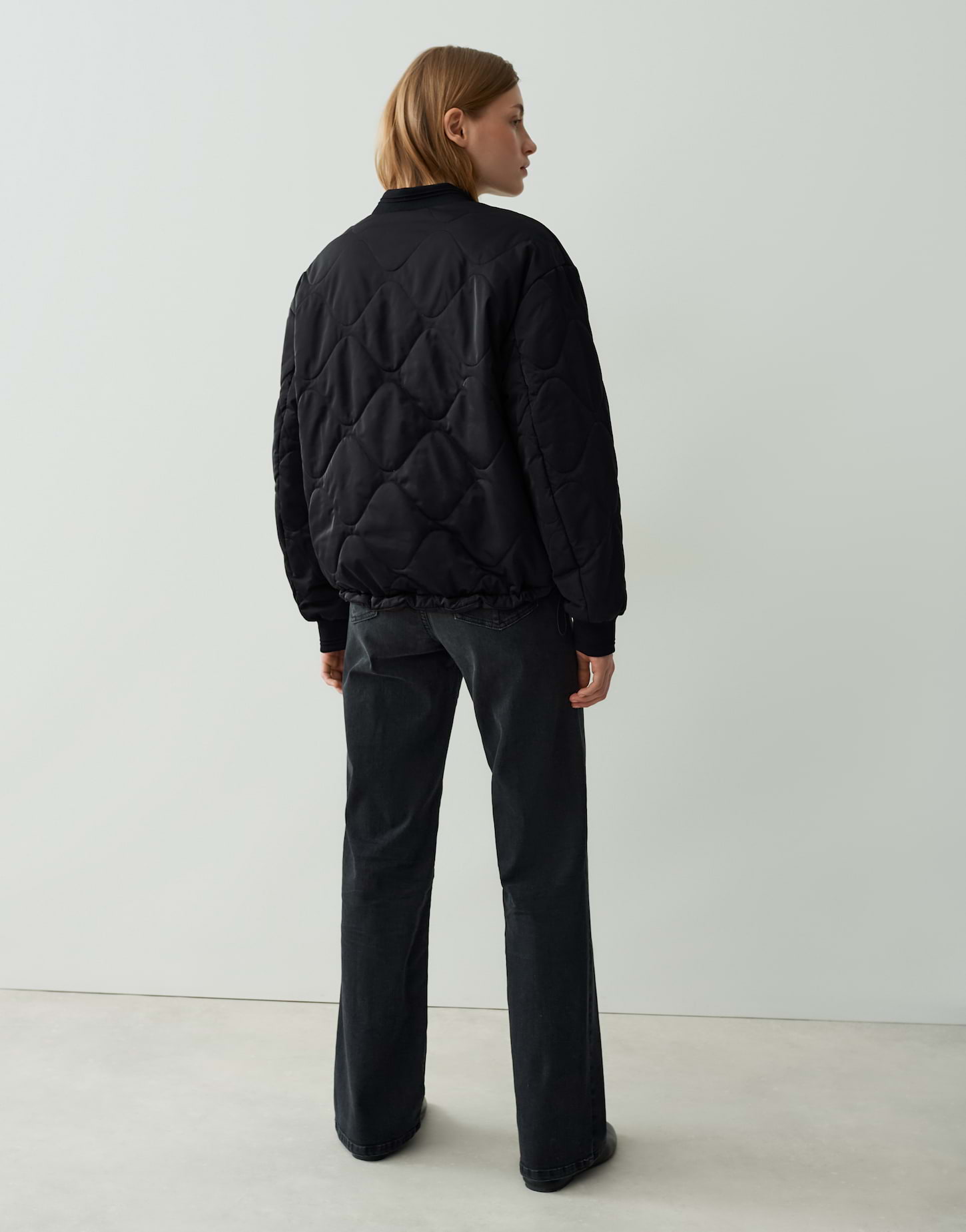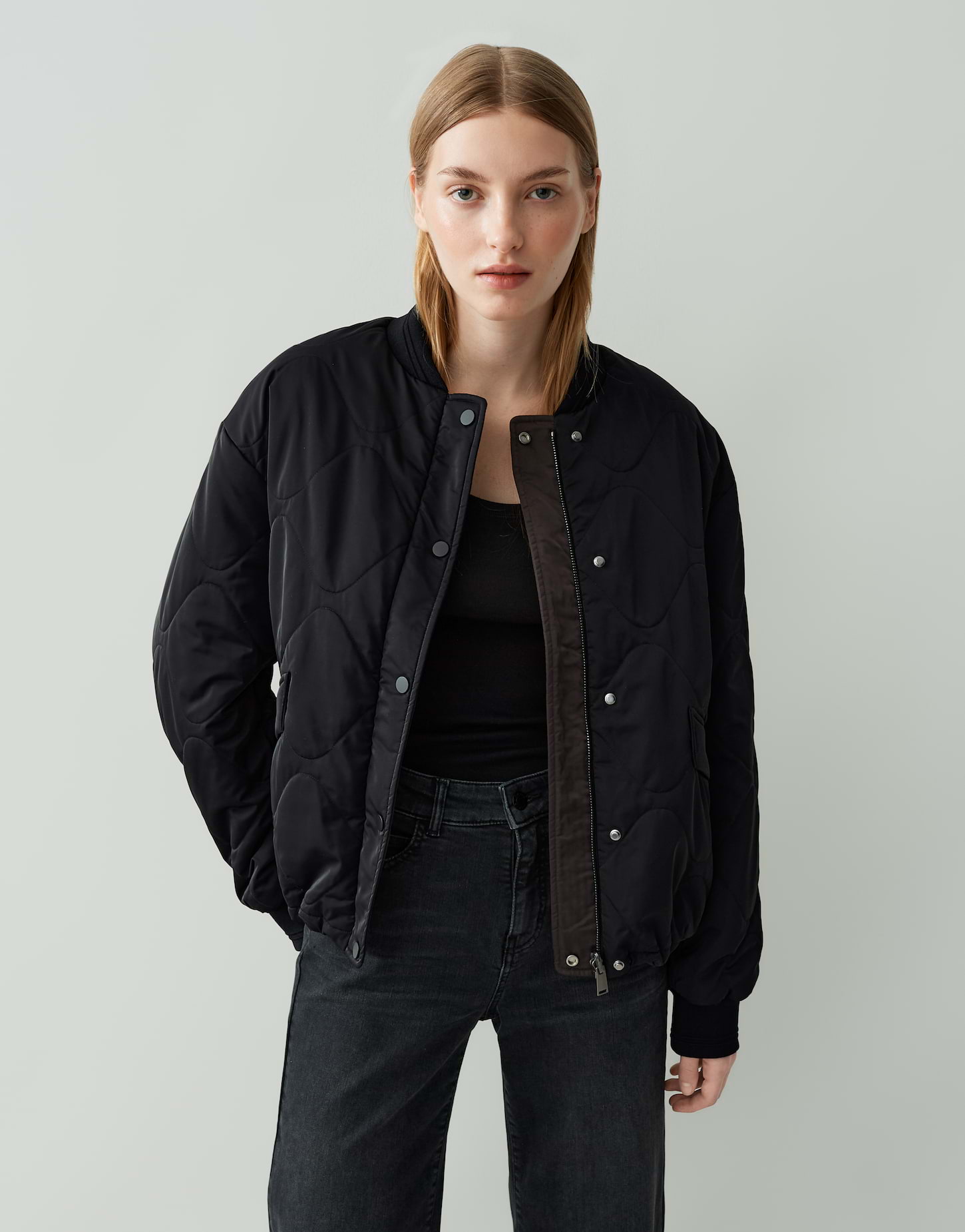Die wattierte Jacke Hallinu von OPUS ist die perfekte Wahl für stilbewusste Tage bei wechselhaftem Wetter. In klassischem Schwarz gehalten, überzeugt sie durch ihre moderne, leicht ausgestellte Silhouette und praktische Funktionalität. Die wendbare Verarbeitung bietet zwei Looks in einem, während die wasserabweisende, windresistente Qualität und die recycelte Wattierung angenehme Wärme spenden. Liebevolle Details wie abgesteppte Pattentaschen, ein Tunnelzug im Saum und elastische Rippbündchen machen sie zum vielseitigen Alltagsbegleiter.