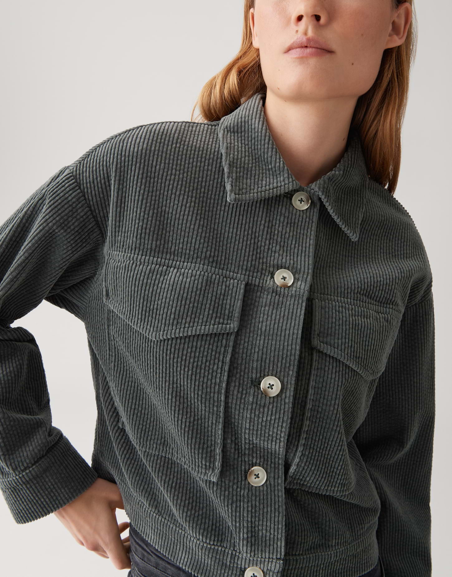 - Details: Verkürzte Länge, aufgesetzte Cargotaschen, Knopfleiste, Schlitz am Ärmelsaum, Knöpfe in Horn-Optik, überschnittene Schultern