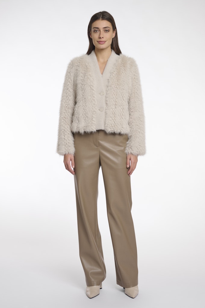 - Details: Eingestrickte Knopfleiste, Mix aus Fake Fur und Strick, leicht verkürzter Schnitt
