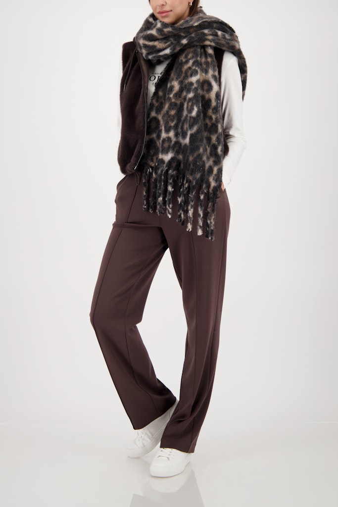 Dieser flauschige Schal mit fransigen Enden und Leomuster bietet nicht nur einen hohen Tragekomfort, sondern auch einen trendigen Look.