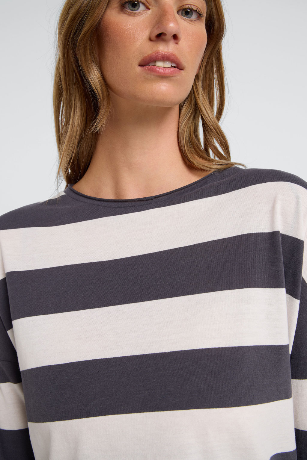 - Details: Überschnittene Schultern, breites Streifenmuster, cleanes Design