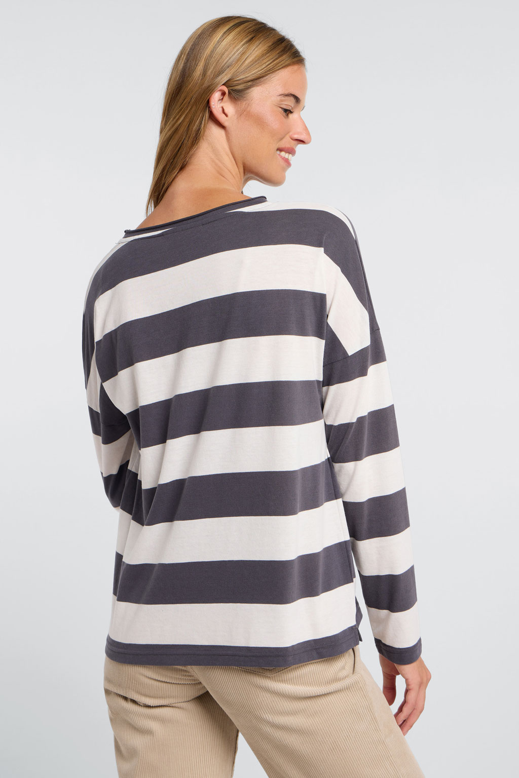 Das Longsleeve "Milia" von Elbsand bringt mit seinem breiten Streifenmuster einen maritimen Klassiker in modernem Look in deine Garderobe. In Schwarz-Weiß gehalten, wirkt es frisch, zeitlos und lässt sich vielseitig kombinieren. Der weiche Jersey-Stoff sorgt für ein angenehmes Tragegefühl - perfekt für entspannte Freizeit-Outfits oder den lässigen Alltagslook.