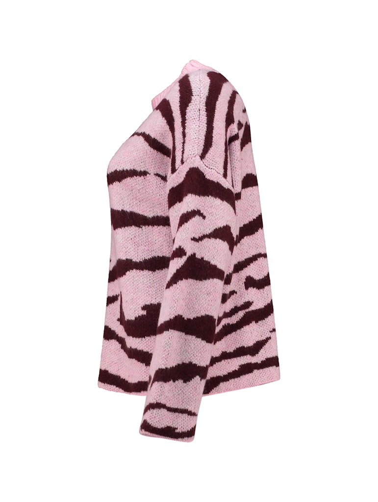 Strickpullover in Zebra-Muster, sowie leicht überschnittene Schultern und einem kleinen Stehkragen/Rundhals