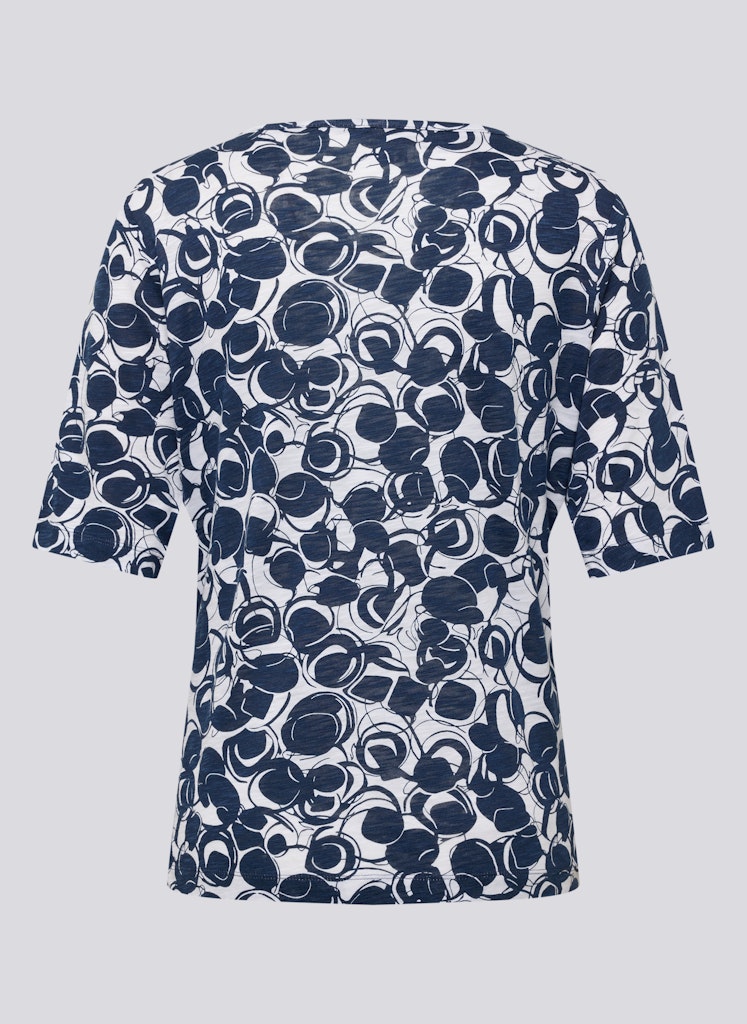 Dieses Shirt bringt mit seinem dynamischen Allover-Muster frischen Schwung in Ihre Garderobe. Die abstrakten Formen verleihen dem Look eine kreative Note, während der klassische Schnitt mit Rundhalsausschnitt für optimalen Tragekomfort sorgt. Perfekt für urbane Alltagsoutfits oder als modisches Statement im Büro.Abstrakter Allover-Print mit modischem Flair.Bequemer Rundhalsausschnitt.Halbarm für angenehme Bewegungsfreiheit.Leicht taillierter Schnitt für eine feminine Silhouette.Pflegeleichte, elastische Qualität.