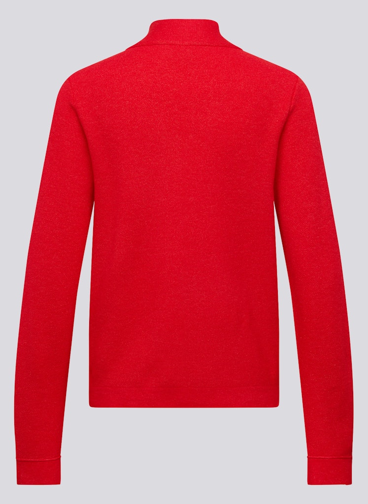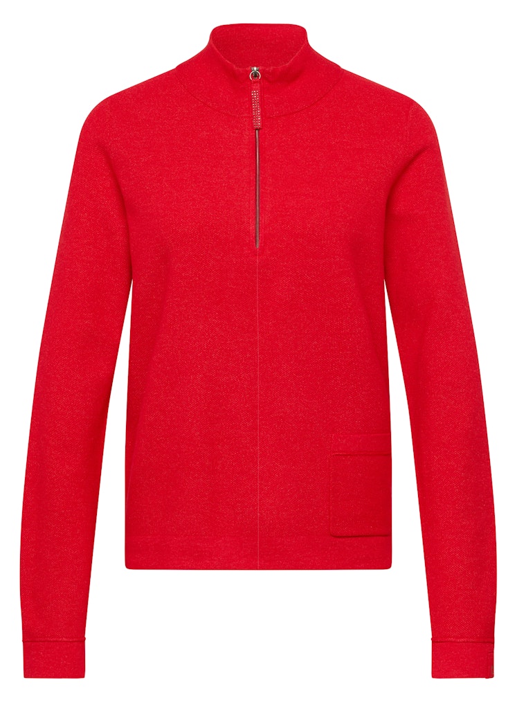 Dieser Pullover überzeugt mit seinem sportlichen Reißverschluss-Stehkragen und der angenehm strukturierten Strickqualität. Die leicht melierte Optik und die dezente Tasche am Saum machen das Design alltagstauglich und modern. Dank des soften Materialmixes trägt sich das Modell besonders komfortabel. Der körpernahe Schnitt sorgt für eine feminine Silhouette. Strukturierter Feinstrick. Reißverschluss-Stehkragen. Dezente Saumtasche. Trageangenehmer Materialmix. Figurbetonte Passform.