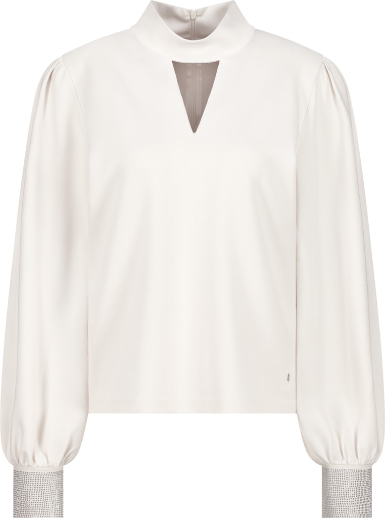 Dieses Sweatshirt besticht durch seinen stilvollen Cut-out unter dem Stehkragen sowie durch breite Ärmelbündchen mit tonigem Strass und Kräuselung.
