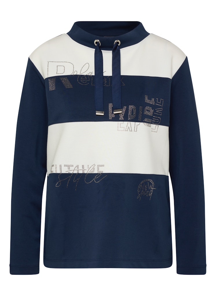 Dieses sportive Sweatshirt überzeugt mit modischem Tunnelzugkragen und breiten Farbblöcken in harmonischem Kontrast. Dezente Strasssteine unterstreichen die Frontdetails und verleihen dem Look eine raffinierte Note. Die weiche Qualität sorgt für angenehmen Tragekomfort _ ideal für lässige Alltags-Outfits. Tunnelzugkragen mit breiten Bändern. Strassdetails auf der Vorderseite. Breite Farbblöcke in Kontrastoptik.