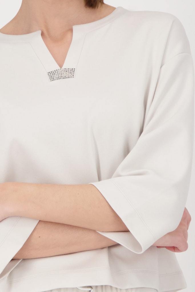 Dieses elegante Sweatshirt von Monari vereint zeitlose Schlichtheit mit einem Hauch Glamour. Der schlichte Schnitt wird durch den markanten Schlitzausschnitt mit funkelnden Strasssteinen stilvoll aufgewertet, während der weiche Stoff für höchsten Tragekomfort sorgt. Perfekt für lässige Freizeitlooks oder schicke Alltags-Outfits.