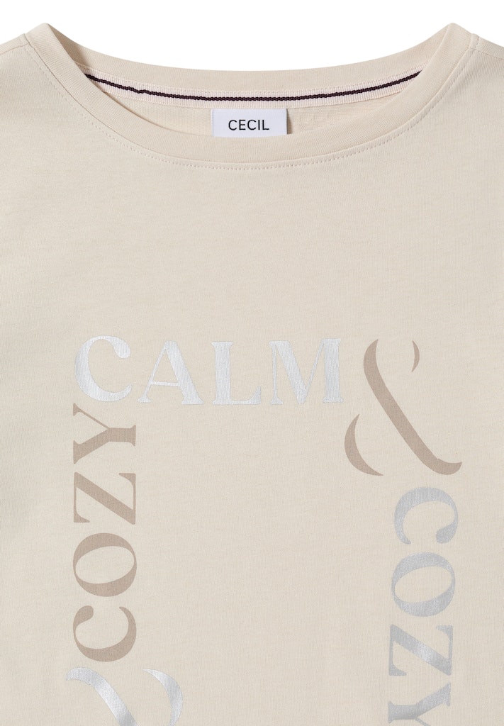 Dieses T-Shirt von CECIL für Damen bringt mit seinem Frontprint samt glänzenden Foliendetails modisches Flair in deinen Look. Der U-Boot-Ausschnitt und die reine Baumwolle sorgen für ein angenehmes Tragegefühl – auch an wärmeren Tagen. Perfekt für trendige Casual-Outfits.