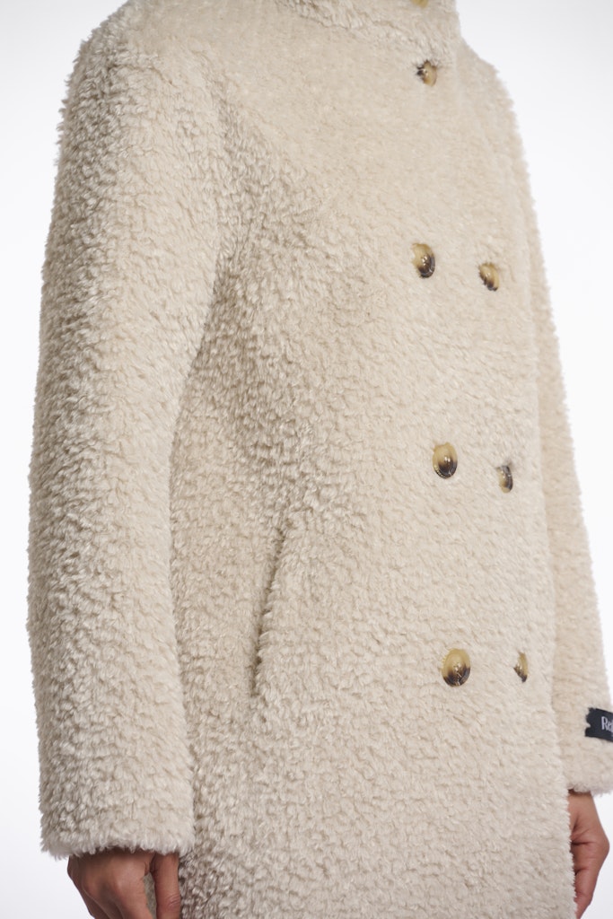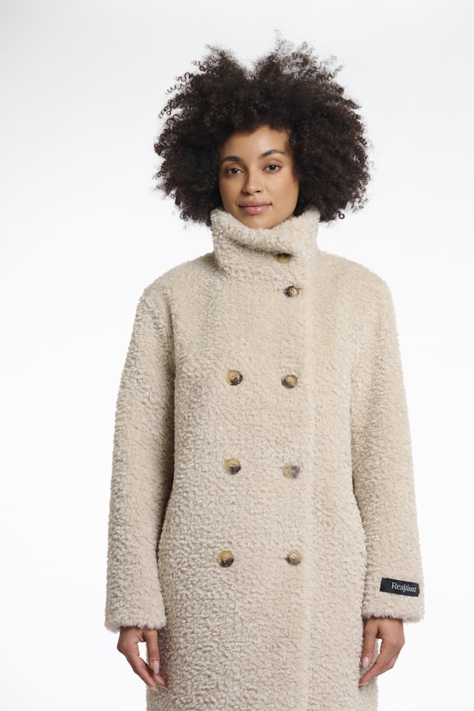 Die Teddyjacke Ena von Rino & Pelle bringt kuscheligen Komfort in eleganter Form. Mit ihrer weichen Teddyfell-Optik in hellem Beige, der doppelreihigen Knopfleiste und dem Stehkragen vereint sie Wärme mit stilvollem Chic. Der gerade, mittellange Schnitt macht sie zum idealen Begleiter für trendige Winter-Outfits - sowohl lässig als auch elegant kombinierbar.
