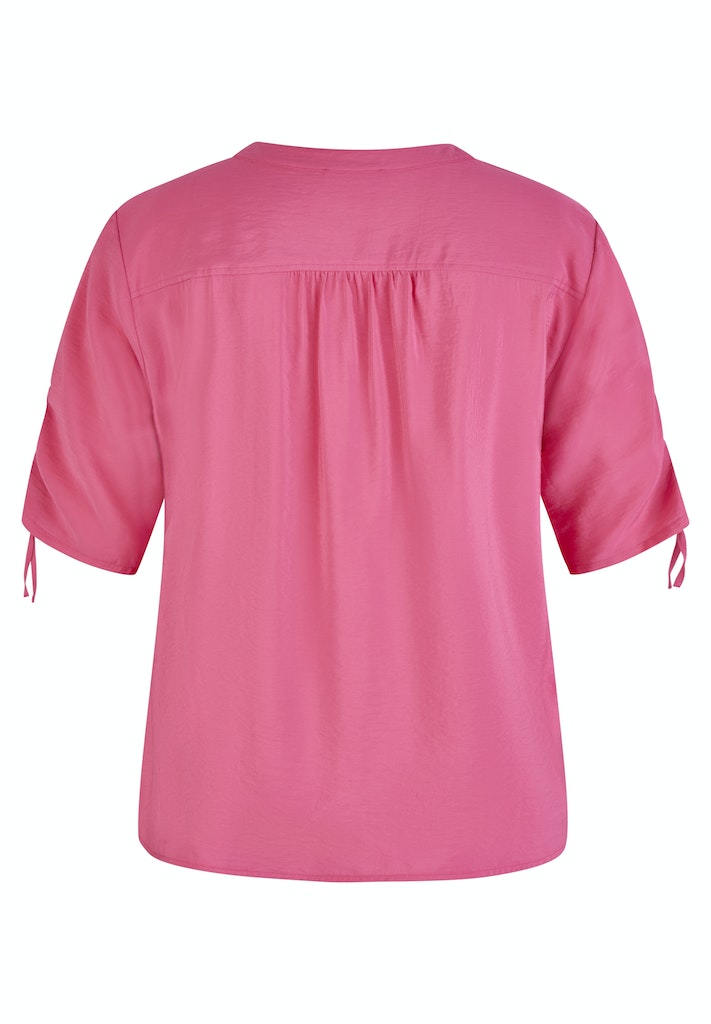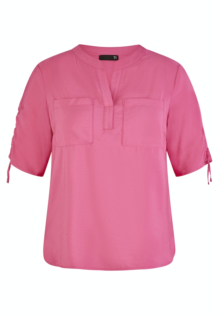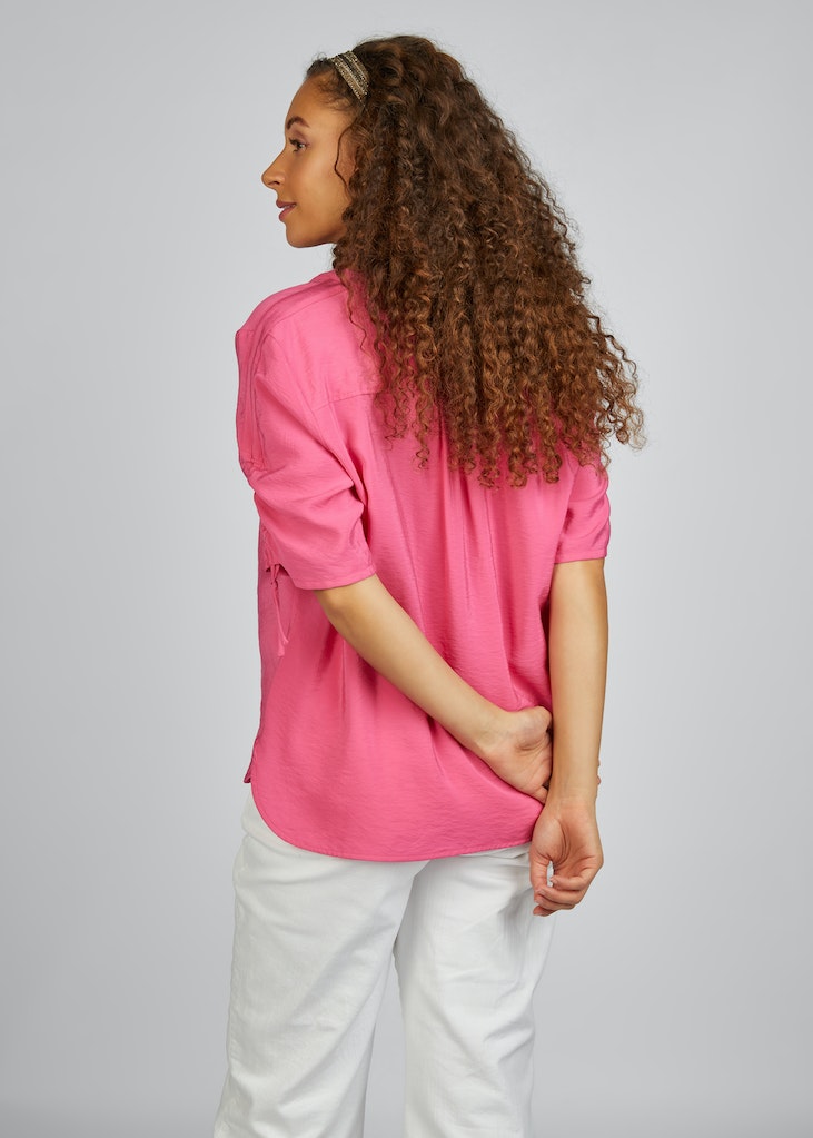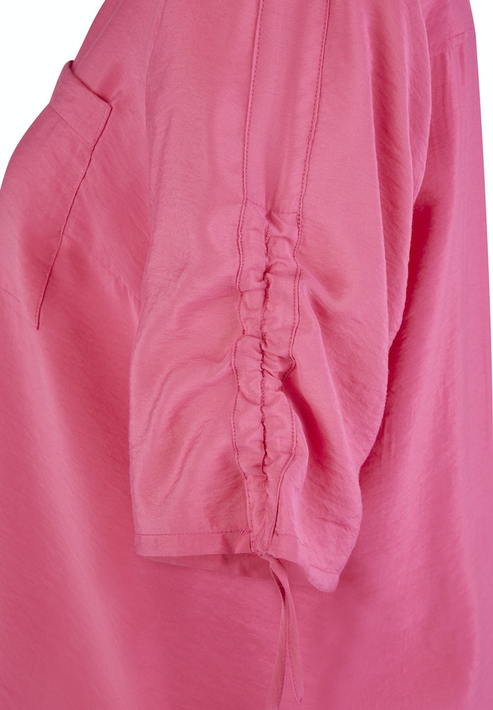 Verspielte Raffdetails mit Zugbändern machen diese Hemdbluse aus Viskose-Mix aus. Die aufgesetzten Brusttaschen und der kleine V-Ausschnitt setzen zusätzliche Akzente. Eine gemusterte Leinenhose passt besonders gut zu der Hemdbluse.