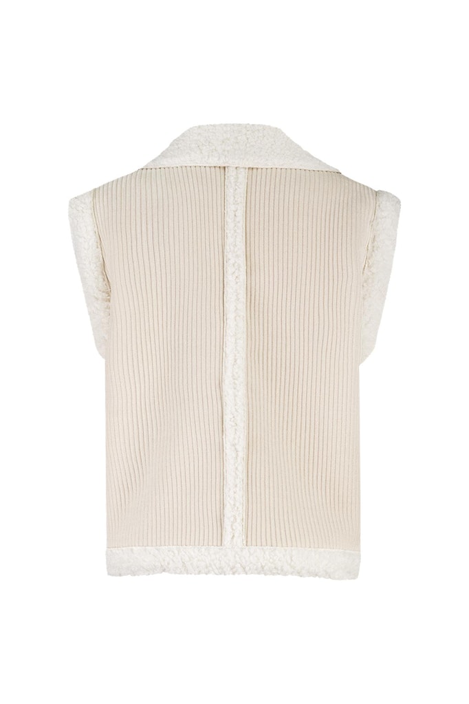 Die wendbare Weste "Nikita" von Studio Anneloes ist ein echtes Highlight für die Übergangszeit. Mit ihrer Kombination aus strukturierter Rippenoptik und kuscheligem Teddy-Futter bietet sie zwei stylische Tragevarianten in einem. Dank des klassischen Reverskragens und der großen aufgesetzten Taschen verbindet sie Komfort mit modischem Chic - ein vielseitiges It-Piece für trendige Layering-Looks.