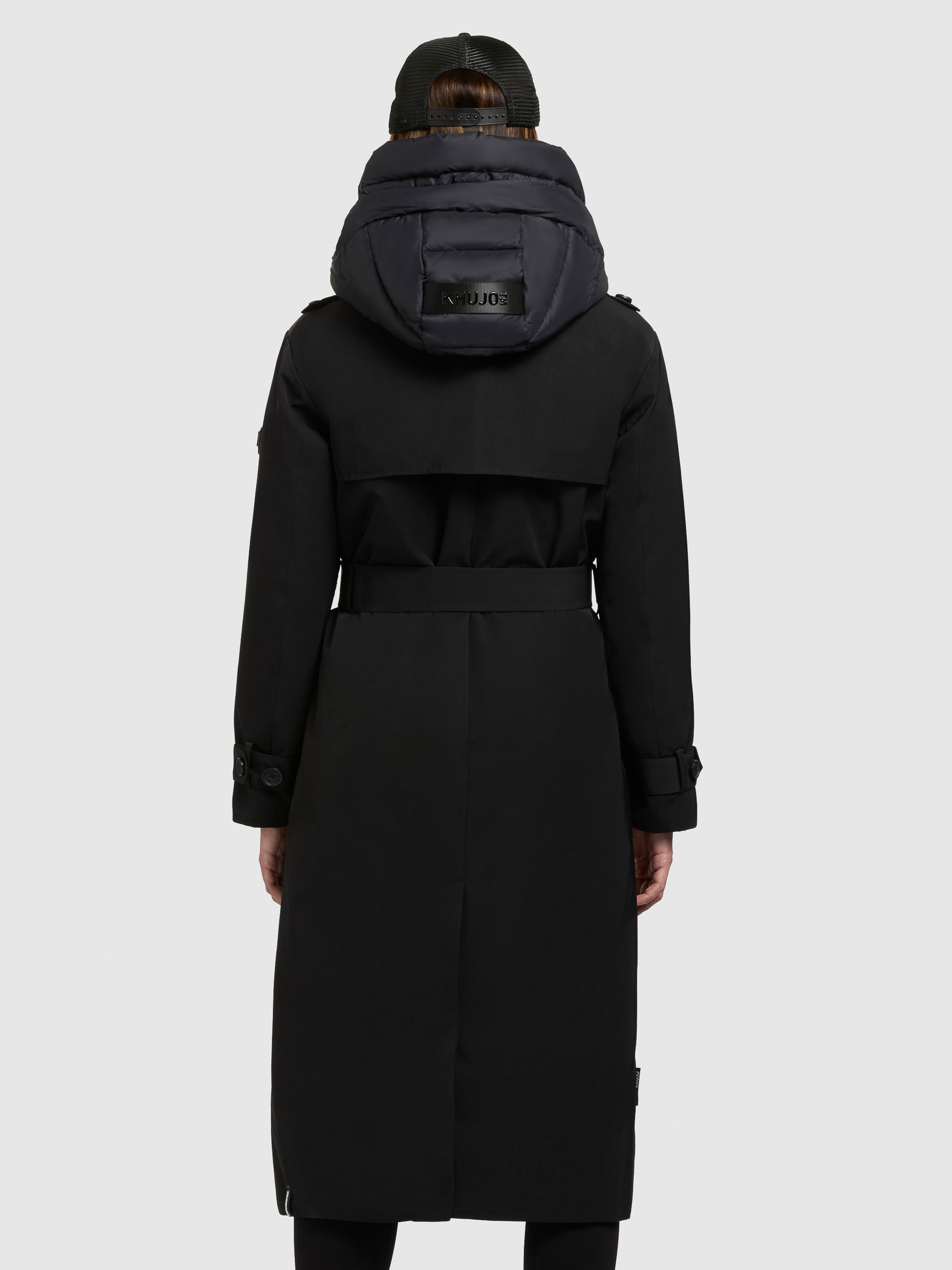 Der schwarze khujo Mantel ELENA ist ein warmer, stilvoller Trenchcoat mit modernen Funktionen - perfekt für modebewusste Frauen, die auch an kalten Tagen nicht auf Eleganz verzichten möchten. Der herausnehmbare Steppeinsatz mit Kapuze sorgt für angenehme Wärme, während der taillierte Schnitt und der Gürtel mit Metallschnalle eine feminine Silhouette betonen. Liebevoll gestaltete Details wie Schulterriegel, Magnetknöpfe und die markante Rückenpasse machen diesen Mantel zu einem echten Highlight der Wintergarderobe. Der Trenchmantel selbst ist wattiert und so wunderbar warm.