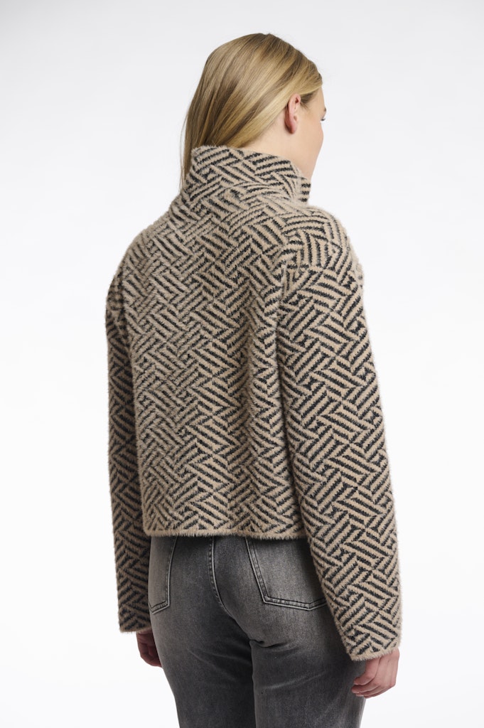 Die kurze Jacke "Beth" von Rino & Pelle begeistert mit ihrem auffälligen geometrischen Muster und der eleganten Doppelreiher-Knopfleiste. Der hohe Stehkragen sorgt für ein stilvolles Erscheinungsbild und angenehme Wärme. Das strukturierte, weiche Material verleiht dem Design eine moderne Note und macht die Jacke zu einem idealen Begleiter für kühle Tage mit modischem Anspruch.