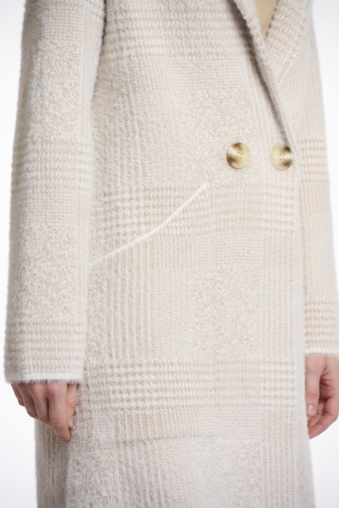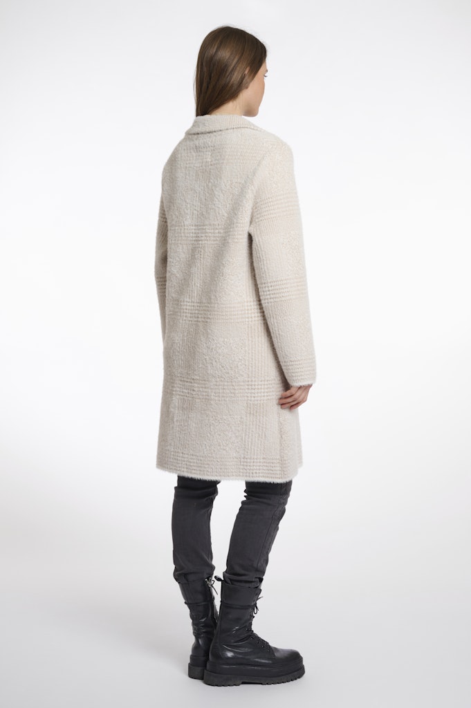 Die lange Jacke Madina von Rino & Pelle überzeugt durch ihre elegante Struktur und zeitlose Raffinesse. In hellem Creme mit feinem Hahnentritt-Muster strahlt sie klassische Eleganz aus, während die leicht flauschige Textur für einen modernen Twist sorgt. Der lange, gerade Schnitt mit Reverskragen und doppelreihiger Knopfleiste macht sie zum perfekten Begleiter für stilvolle City- und Office-Looks.
